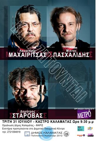 Σήμερα Τρίτη 31 Ιουλίου και ώρα 9.30 το βράδυ στο Αμφιθέατρο του Κάστρου Καλαμάτας θα πραγματοποιηθεί η ΜουσικοΧιουμοριστική παράσταση του Καλοκαιριού 2012 από το Λαυρέντη Μαχαιρίτσα, το Μίλτο Πασχαλίδη και το Δημήτρη Σταρόβα.