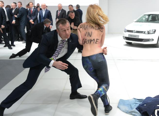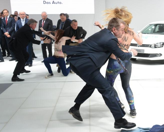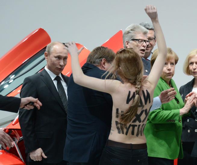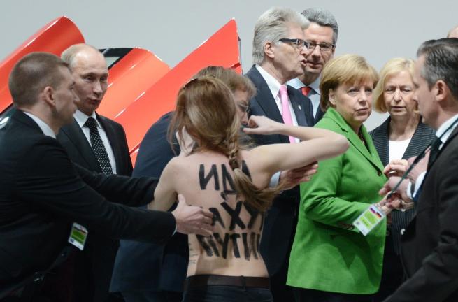 Ο Πούτιν και η Μέρκελ ήταν στο περίπτερο της γερμανικής αυτοκινητοβιομηχανίας Volkswagen, συνοδευόμενοι από τον πρόεδρο του ομίλου Μάρτιν Βίντερκορν, όταν τέσσερις γυναίκες που φώναζαν "Fuck dictator!", όρμησαν πάνω στην εξέδρα.