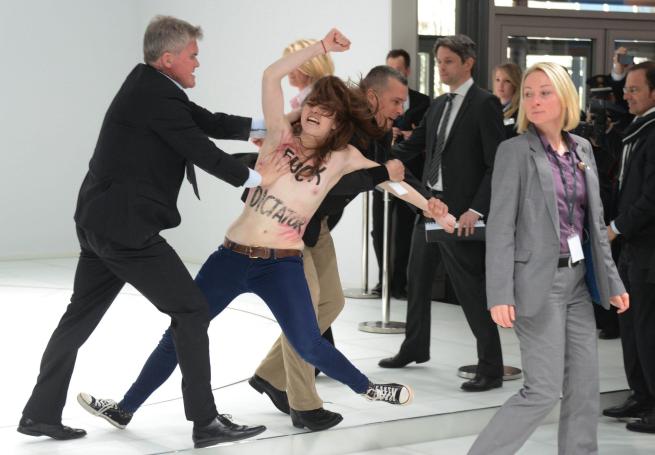 Σε εικόνες που μετέδωσε το γερμανικό τηλεοπτικό δίκτυο συνεχούς ενημέρωσης NTV, βλέπει κανείς δύο απ' αυτές τις γυναίκες, που είχαν γραμμένο στο σώμα τους με μαύρη μπογιά το σύνθημα που φώναξαν, να τίθενται με δυσκολία υπό έλεγχο από την αστυνομία.