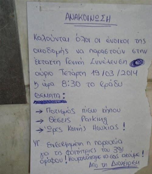 Τις τελευταίες μέρες κυκλοφορεί μία φωτογραφία στο internet μέσω των social media όπου διαχειριστής καλεί τους ενοίκους σε γενική συνέλευση.