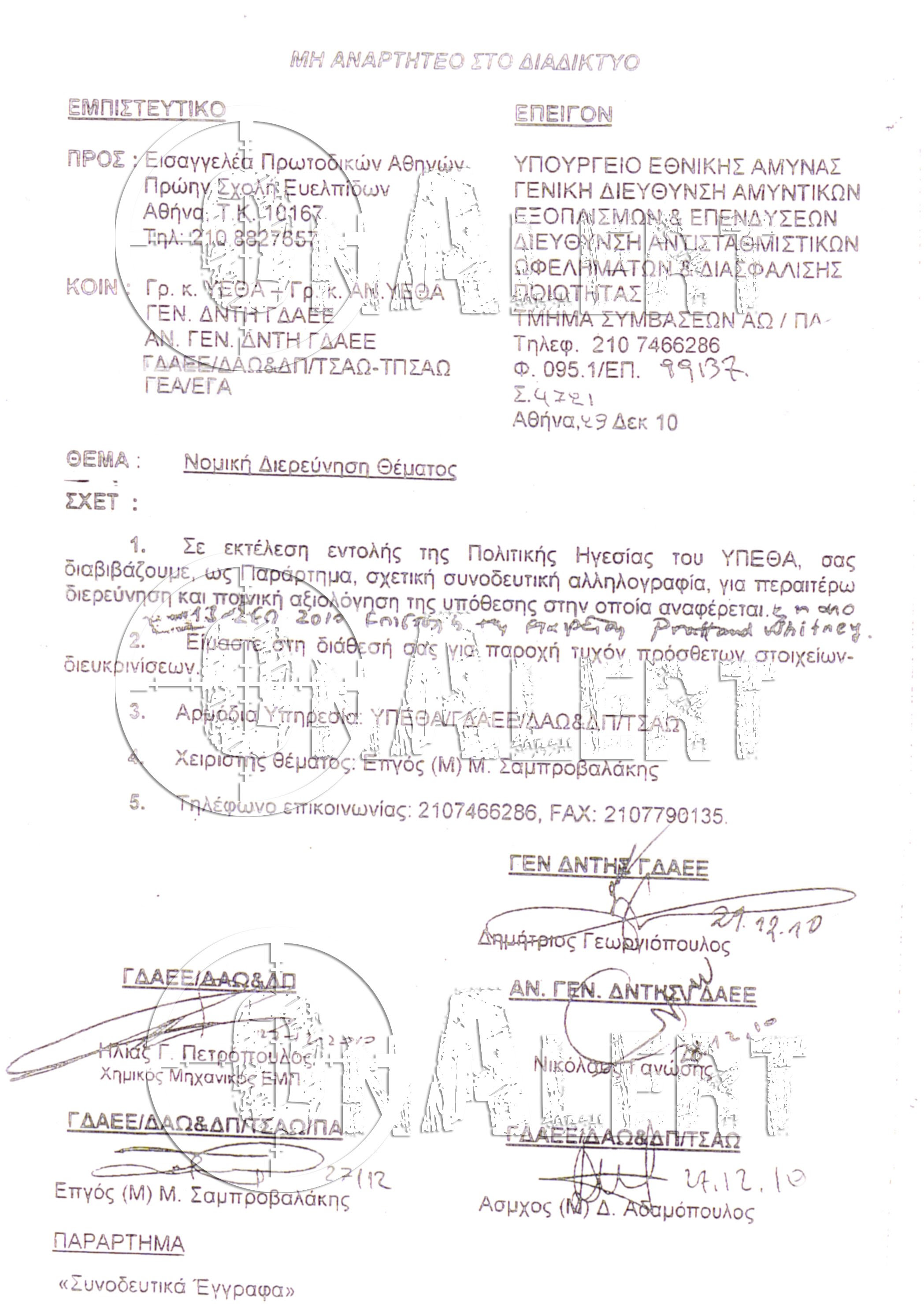Η επιστολή είναι απάντηση στον επικεφαλής της ΓΔΕ επί Μεϊμαράκη και Βενιζέλου από την αμερικανική εταιρεία Pratt and Whitney.