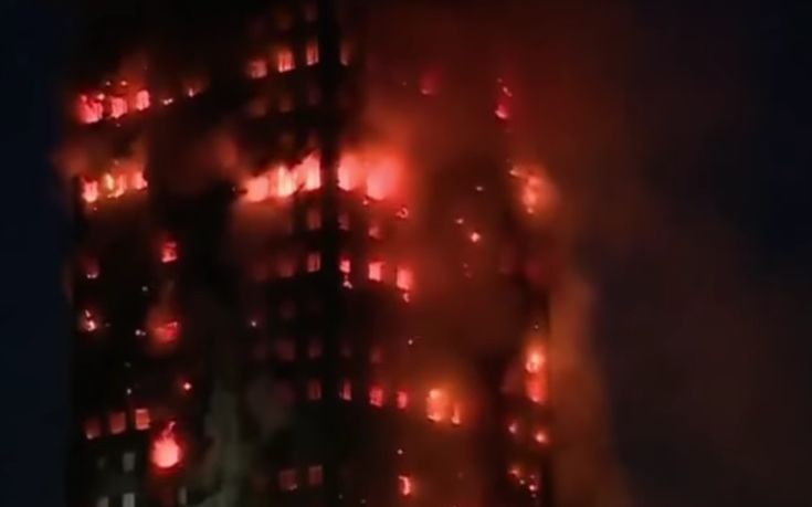 Η φωτιά έχει επεκταθεί από τους κάτω ορόφους προς τα επάνω και κατακαίει τον πύργο, ενώ μία στήλη μαύρη καπνού είναι διακριτή στον ουρανό του Λονδίνου.
