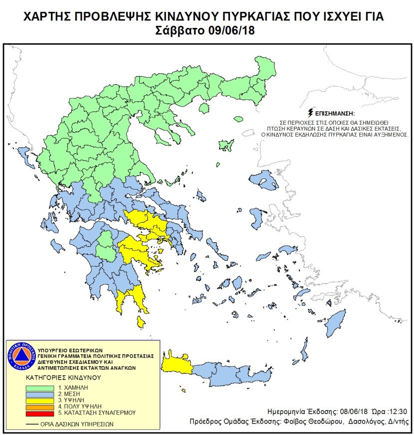 Σύμφωνα με τον χάρτη πρόγνωσης της Γενικής Γραμματείας Πολιτικής Προστασίας ο κίνδυνος πρόκλησης νέων πυρκαγιών απομακρύνεται για άυριο Σάββατο αλλά χρειάζεται μεγάλη προσοχή από όλους μας
