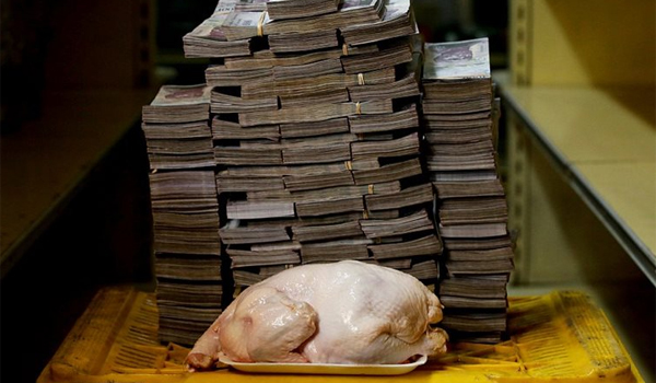 Για ένα κοτόπουλο 2,4 κιλών ένας κάτοικος της Βενεζουέλας θα πρέπει να έχει μαζί του και μια βαλίτσα για να μεταφέρει τα 14,6 εκατ. μπολιβάρ (2,2 δολάρια) που απαιτούνται.