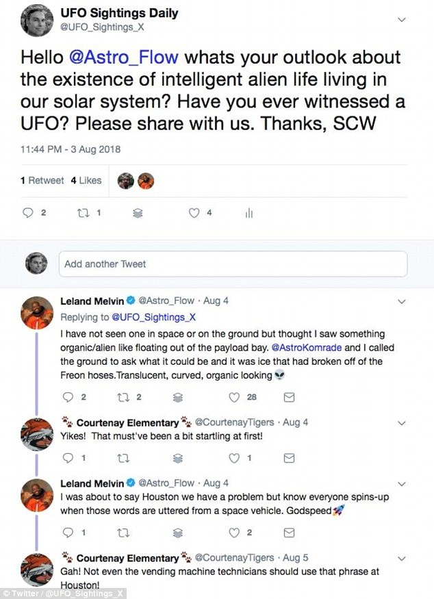 Η αποκάλυψη έγινε στο Twitter κατά τη διάρκεια συζήτησης ανάμεσα στον 54χρονο Leland Melvin που εργαζόταν ως μηχανικός στο διαστημικό λεωφορείο και τον Scott C. Waring που διαχειρίζεται τη σελίδα UFO Sightings Daily.