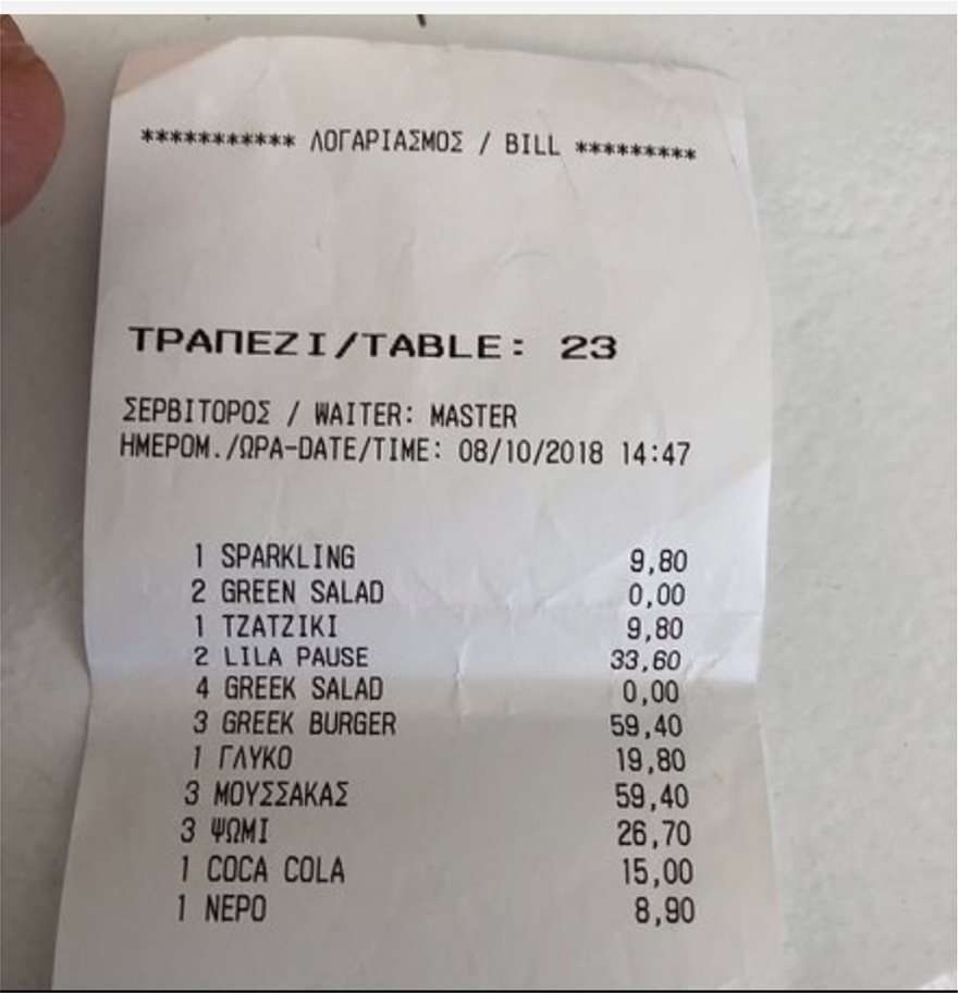 Επίσης, για το ίδιο κατάστημα κι άλλοι τουρίστες έκαναν τα παράπονά τους, καθώς ο διπλός ελληνικός καφές χρωνόταν 10 ευρώ και ένα αναψυκτικό 15 ευρώ, ενώ η μερίδα τζατζίκι 9,80 ευρώ και η μερίδα μουσακά 20 ευρώ.