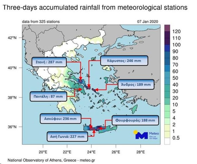Η έντονη κακοκαιρία Ηφαιστίων που έπληξε τη χώρα το τριήμερο Κυριακή 5/1/2020 - Τρίτη 7/1/2020 έδωσε ιδιαίτερα μεγάλα ύψη υετού (βροχοπτώσεις / χιονοπτώσεις) με τα εντονότερα φαινόμενα να εντοπίζονται στην Εύβοια, στην Κρήτη, στις Κυκλάδες και στην Αττική.
